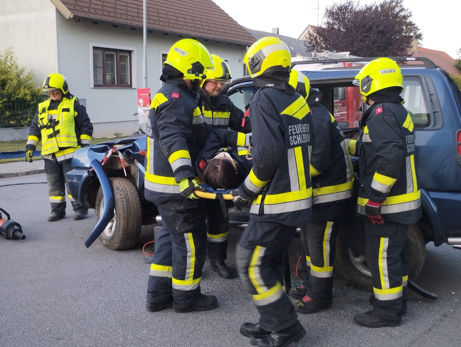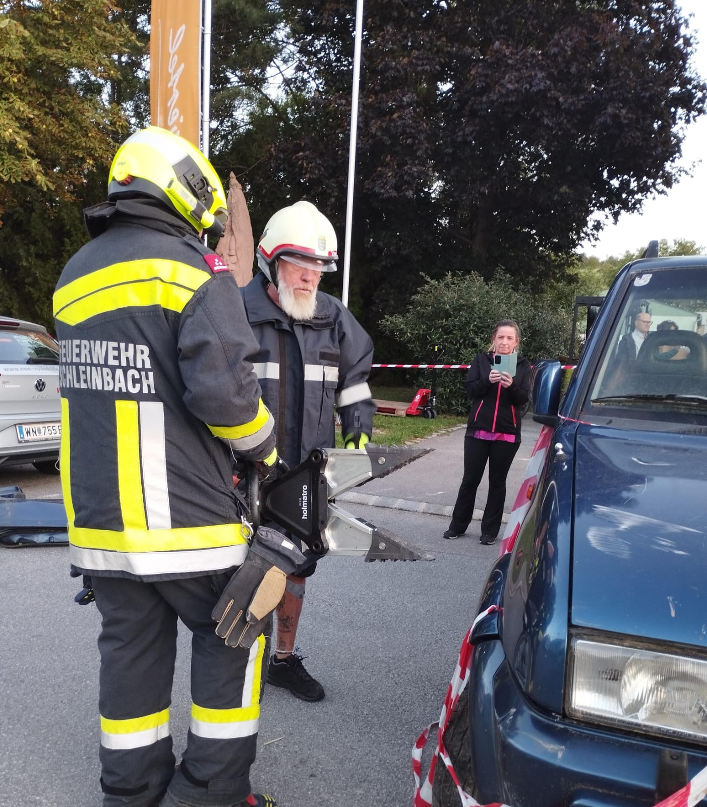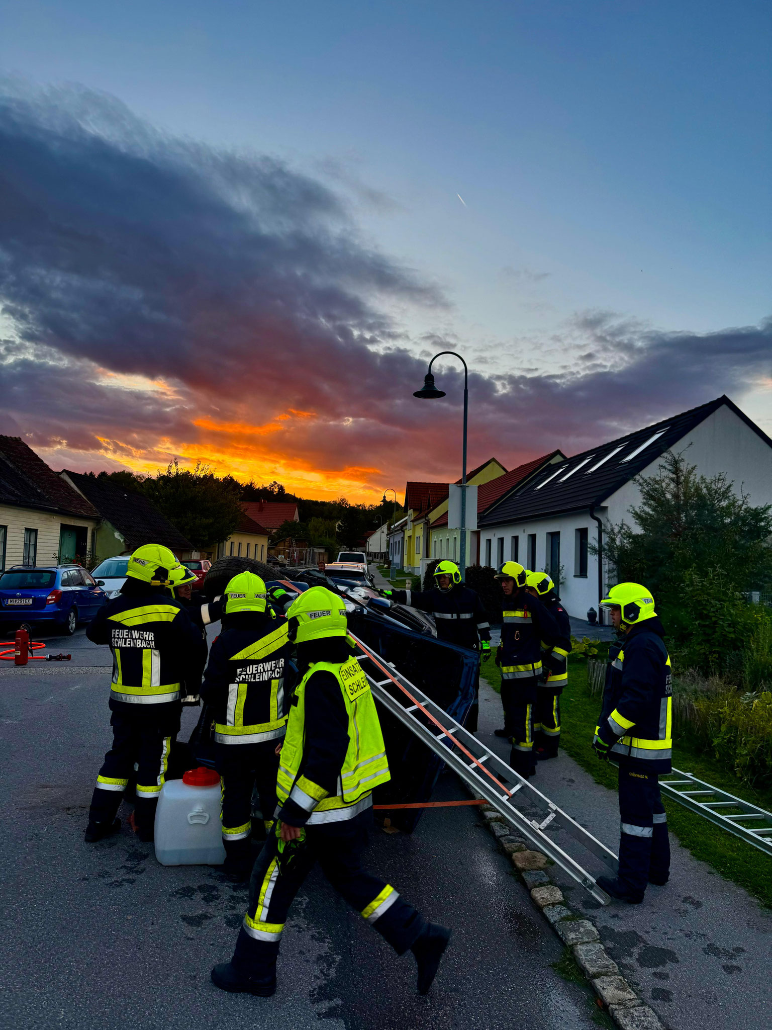 Am Samstag den 25.05. wurde die FF-SCHLEINBACH um 23:31 zu einem Verkehrsunfall mit einer eingeklemmten Person alarmiert. Rettung und Polizei waren bereits anwesend. Auch die Kameraden*innen der FF Unterolberndorf unterstützen uns. Ein Fahrzeug kam aus ungeklärter Ursache von der Straße ab und kam im Bachbett des Schleinbachs zum Liegen. Der Fahrer konnte sich aus eigener Kraft aus dem Fahrzeug befreien. Durch den Einsatz von Hebekissen konnte die Beifahrerin aus dem PKW befreit werden. Da nicht sicher war ob die Beifahrerin innere Verletzungen hatte, wurde sie schonend mittels Spineboard und Korbschleiftrage gerettet und zur weiteren Behandlung durch den Notarzt ins Krankenhaus befördert. Auch der Fahrer wurde zur weiteren Behandlung ins Krankenhaus überstellt. Die Kameraden*innen der FF-Wolkersdorf halfen uns mit ihrem LAST mit Kran das Auto gesichert abzustellen. Da bei dem Unfall eine 20.000 Volt Hochspannungsleitung beschädigt wurde, verständigten wir den Notdienst der EVN, welcher die Leitung vom Netz nahm, damit keine Gefahr besteht.