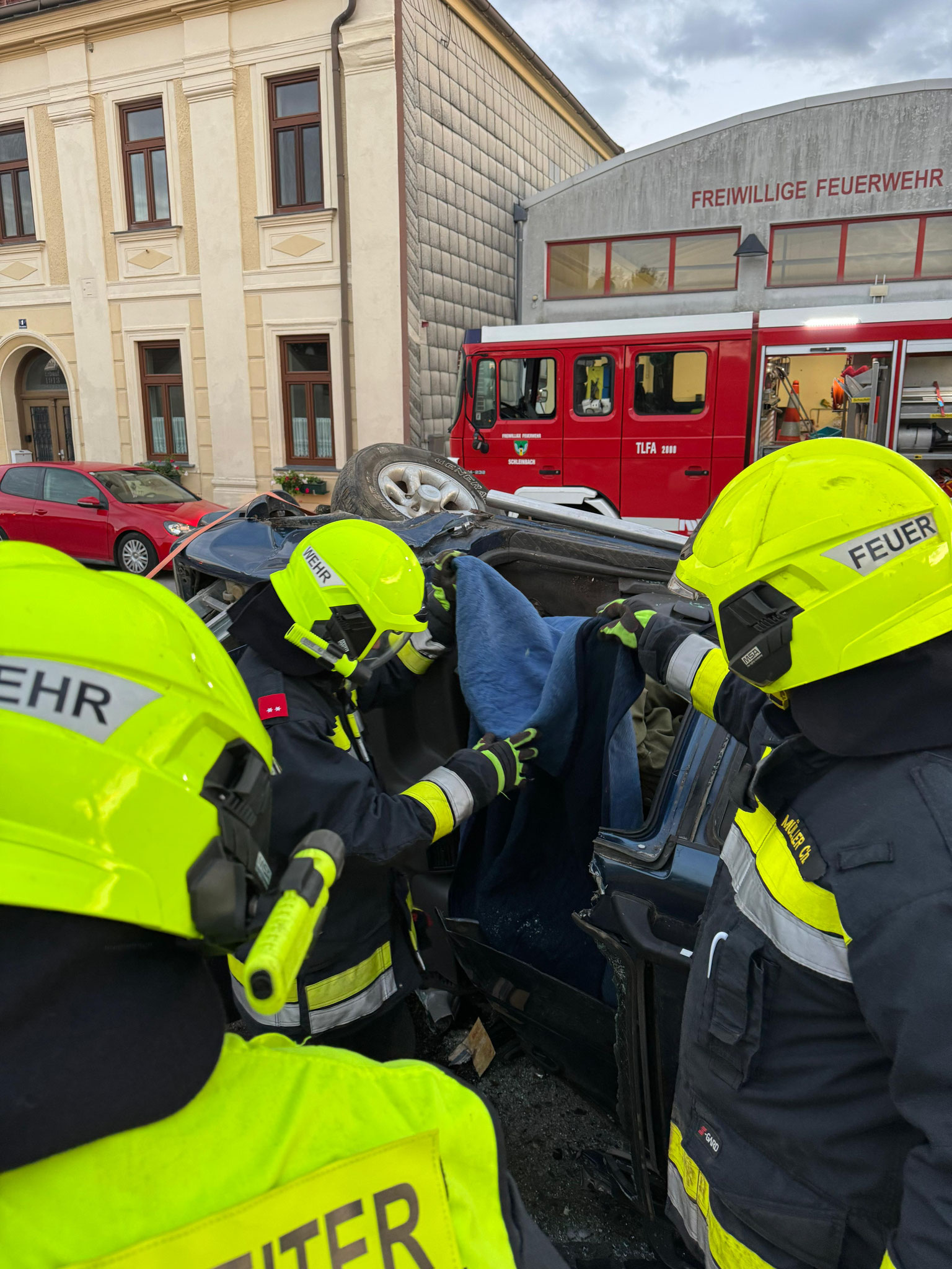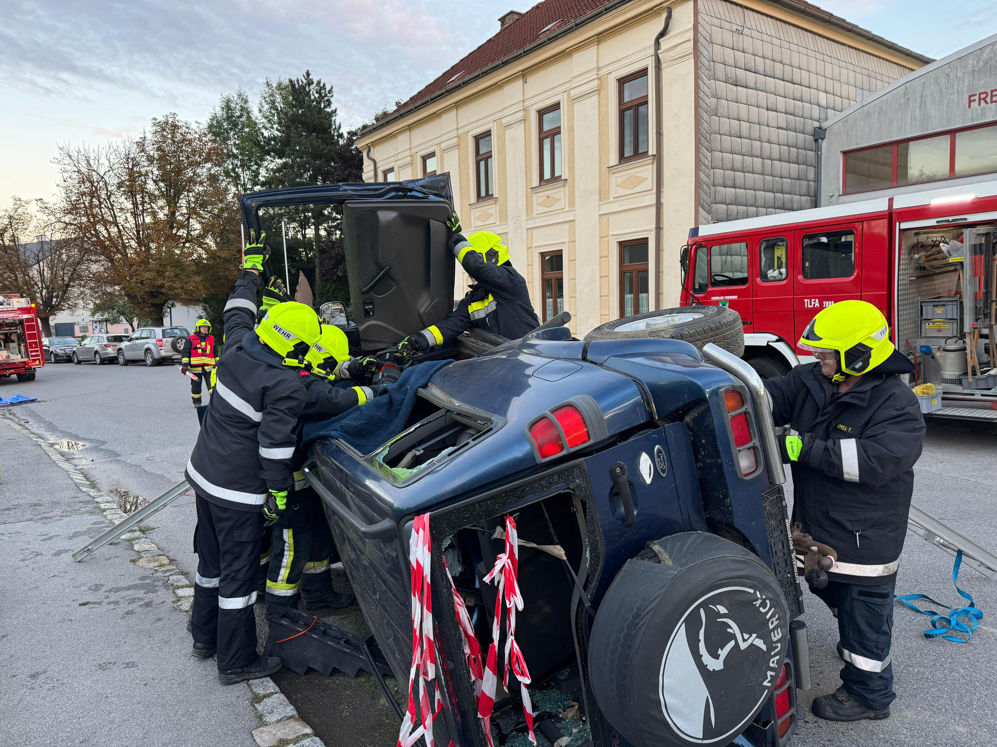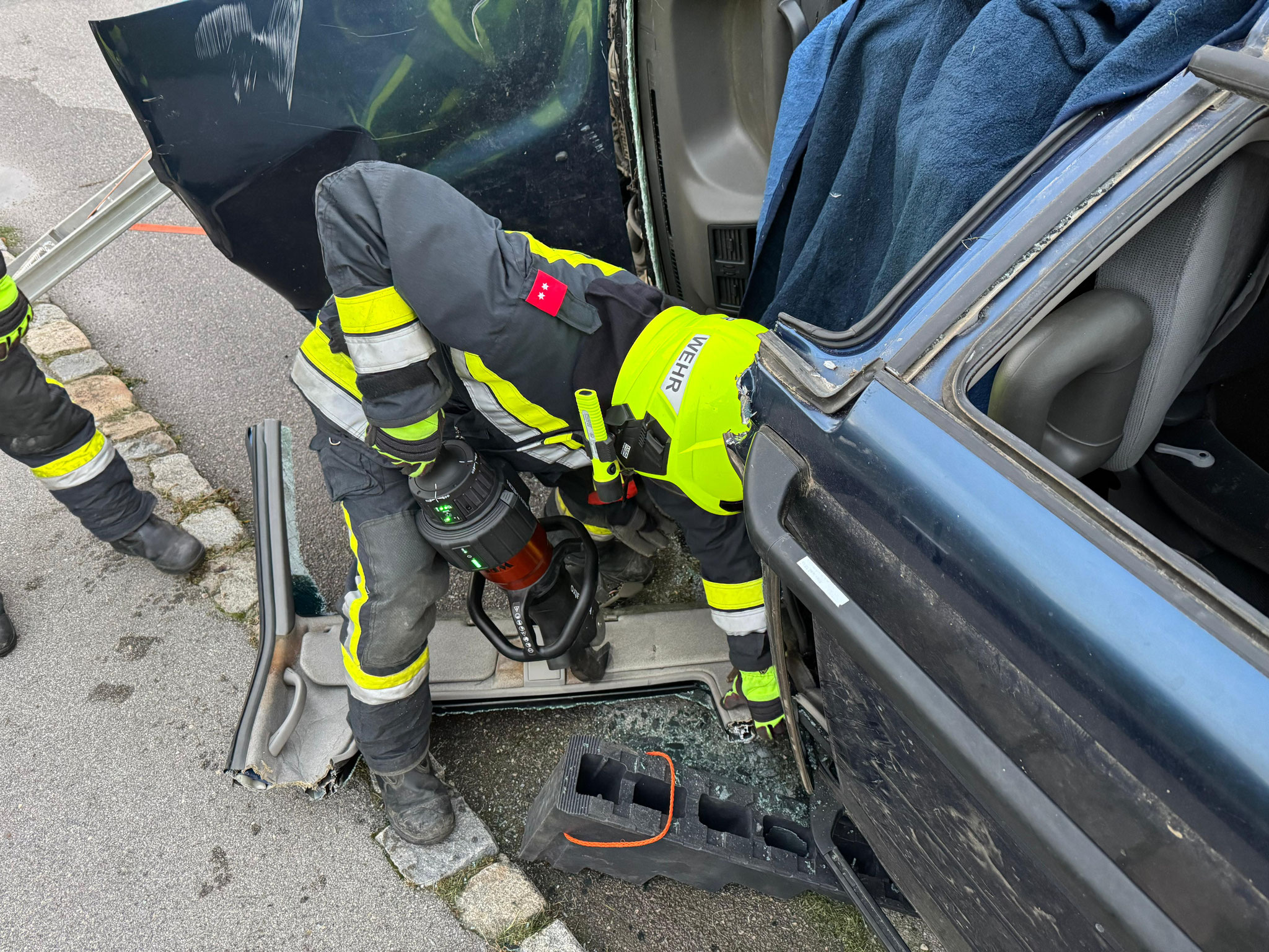 Übungsszenario war die Bergung einer Person aus einem verunfallten Fahrzeug (umgekippt) unter Zuhilfenahme unseres neuen akkubetrieben Rettungssatzes.