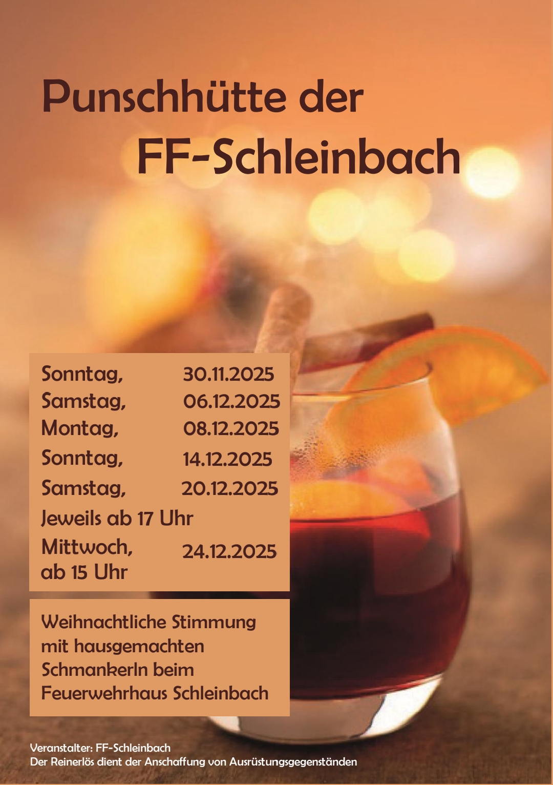 Die Punschhütte ist bereit für euch. Die Termine und Öffnungszeiten entnehmt bitte dem Flyer, welcher auch unter den Fotos ersichtlich ist. Wir freuen uns auf euren Besuch auf ein Tratscherl und leckeren Punsch. Die FF Schleinbach.